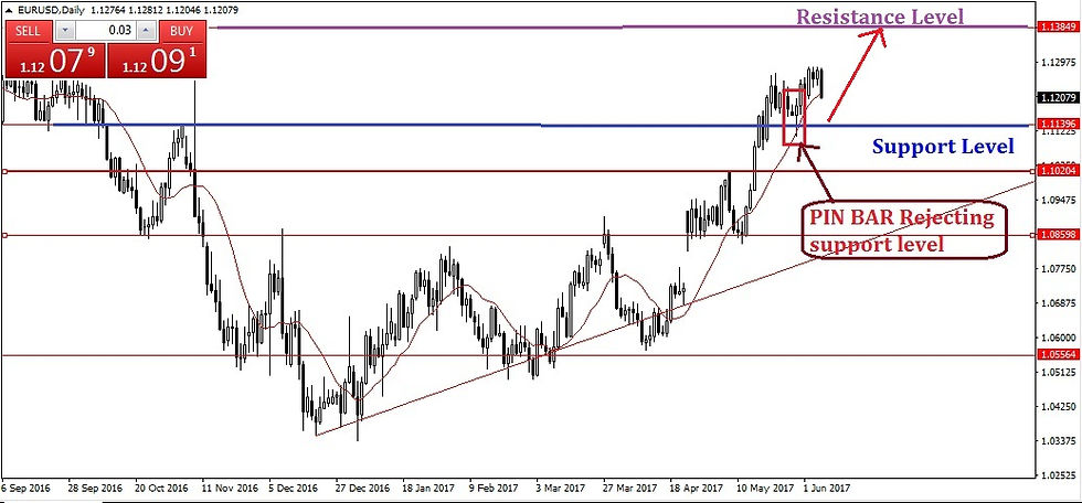 Euro is still showing a very strong upward trend breaking another resistance now support level 1.11396. This is a breakthrough for Euro for more than a month already. Resistance level is visible at 1.13849 (245 Pips distance from support). We can see a very good opportunity to BUY as a PIN-BAR formed rejecting support level. We can enter a trade when it retraces 50% of the Pin-Bar.